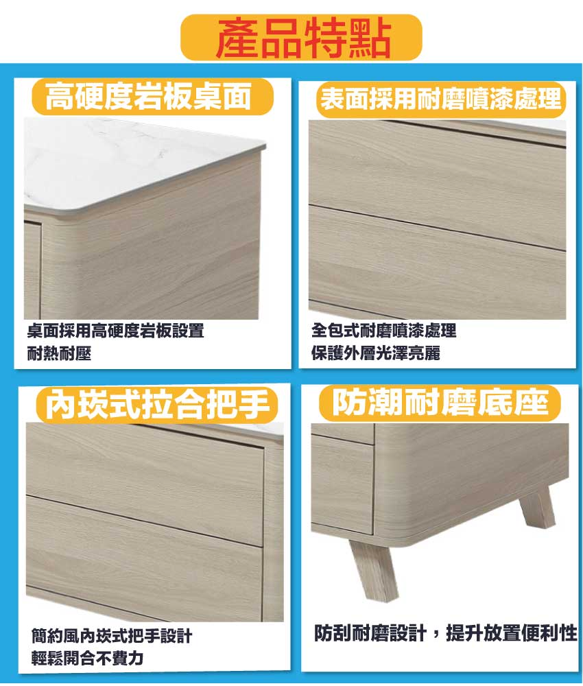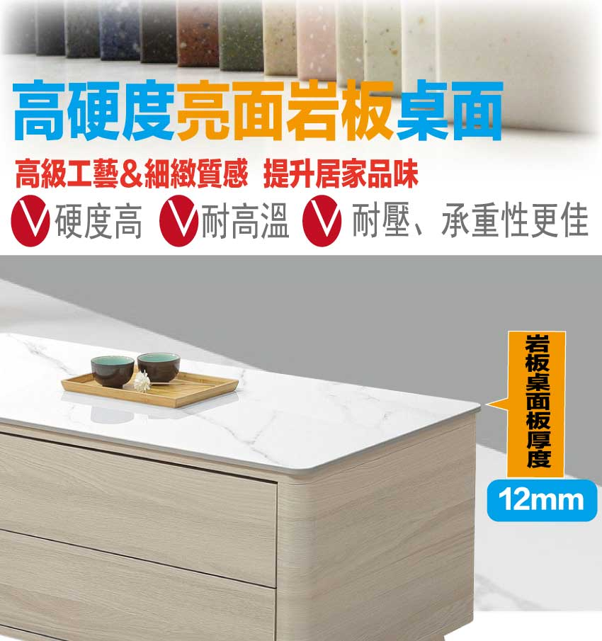 採用防潮MDF板+防潮耐磨底座+五金滑軌結構+12mm高硬度岩板桌面板等安心材質製造
