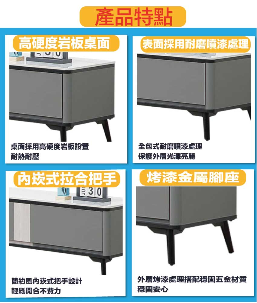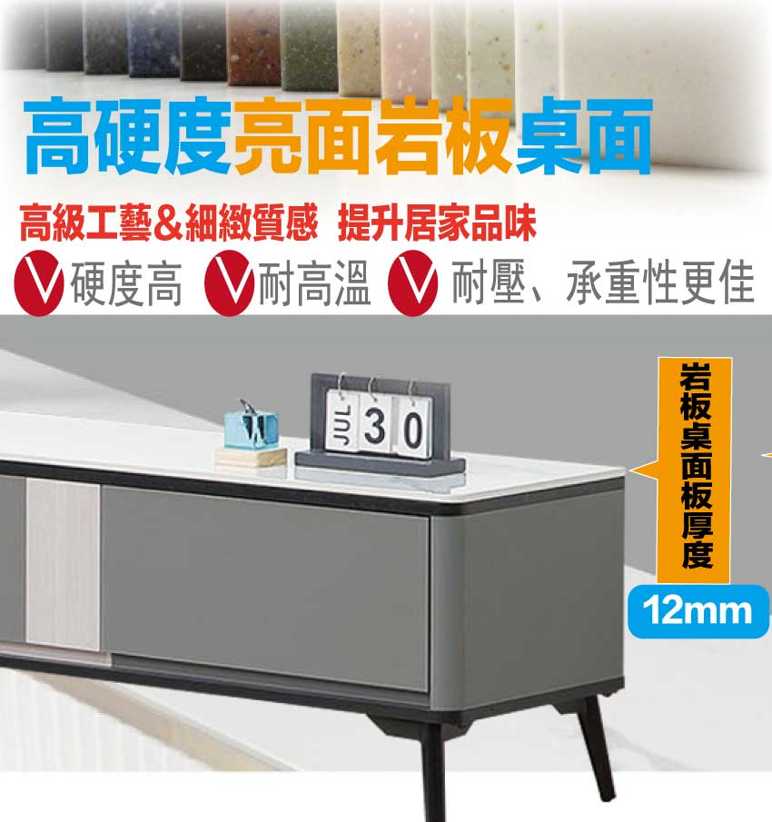 材質:防潮MDF板+烤漆五金腳座+五金滑軌結構+12mm高硬度岩板桌面板