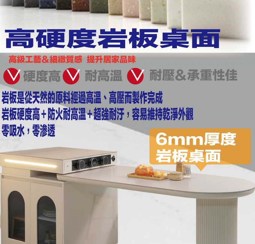 採用防潮MDF板+防潮耐磨底座+五金滑軌結構+6mm高硬度岩板等安心材質製造