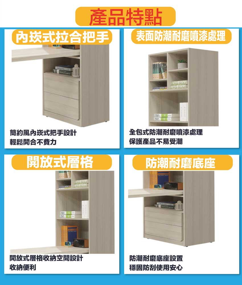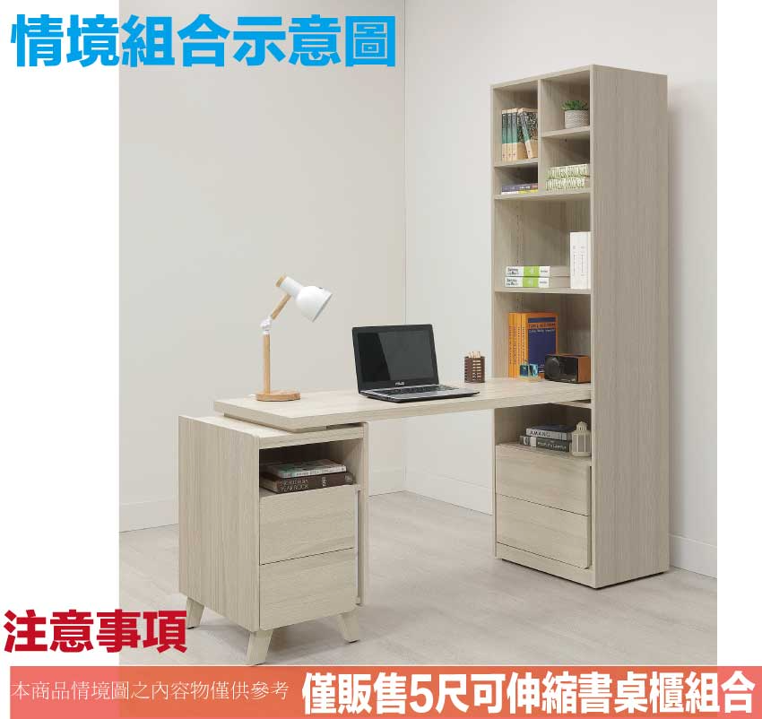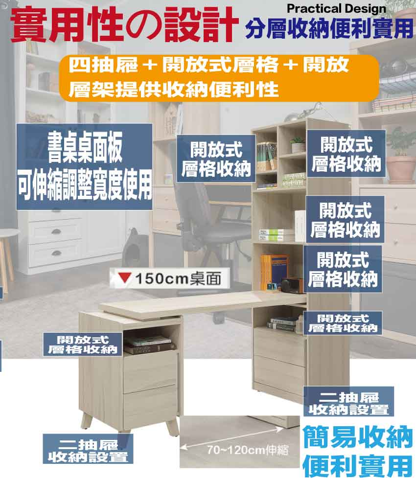 搭配採用二抽屜+可伸縮桌面板+開放層格等收納空間設計