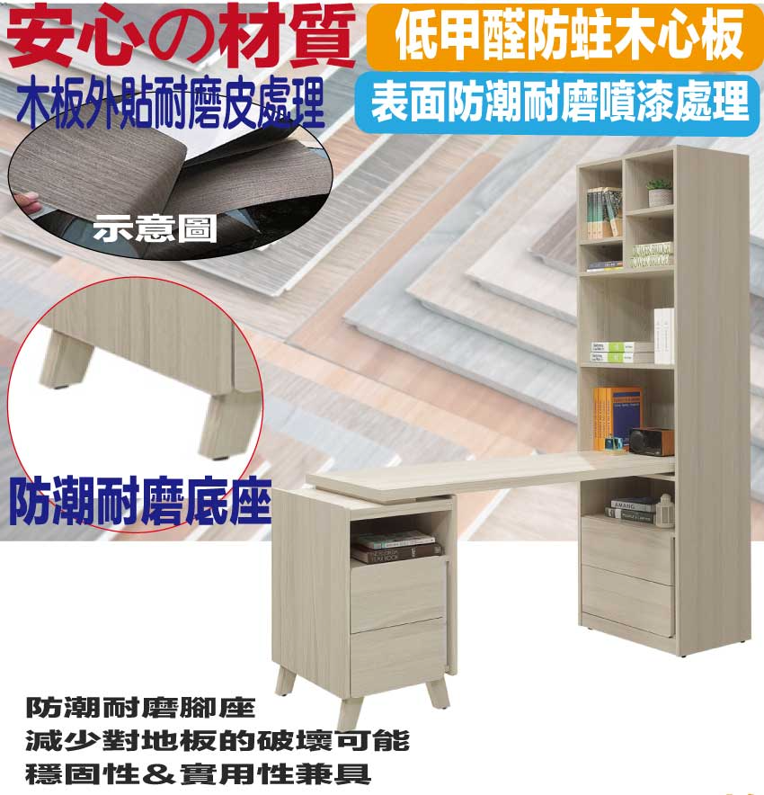 採用防蛀木心板+防潮耐磨底座+仿大理石紋美耐皿材質桌面板+五金滑軌結構等安心材質製造
