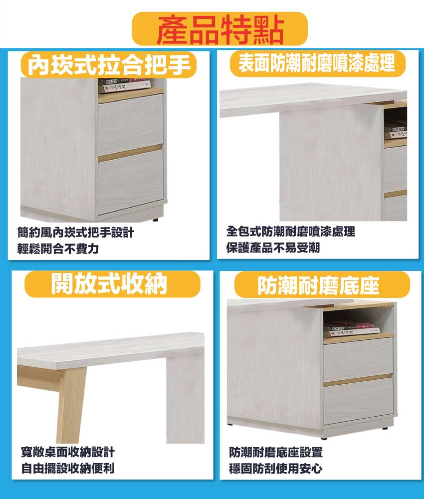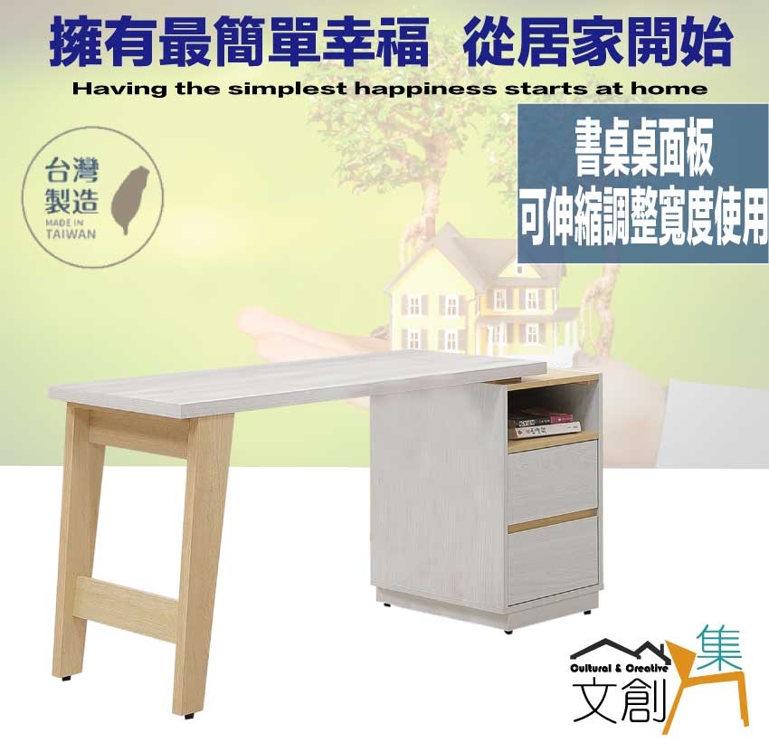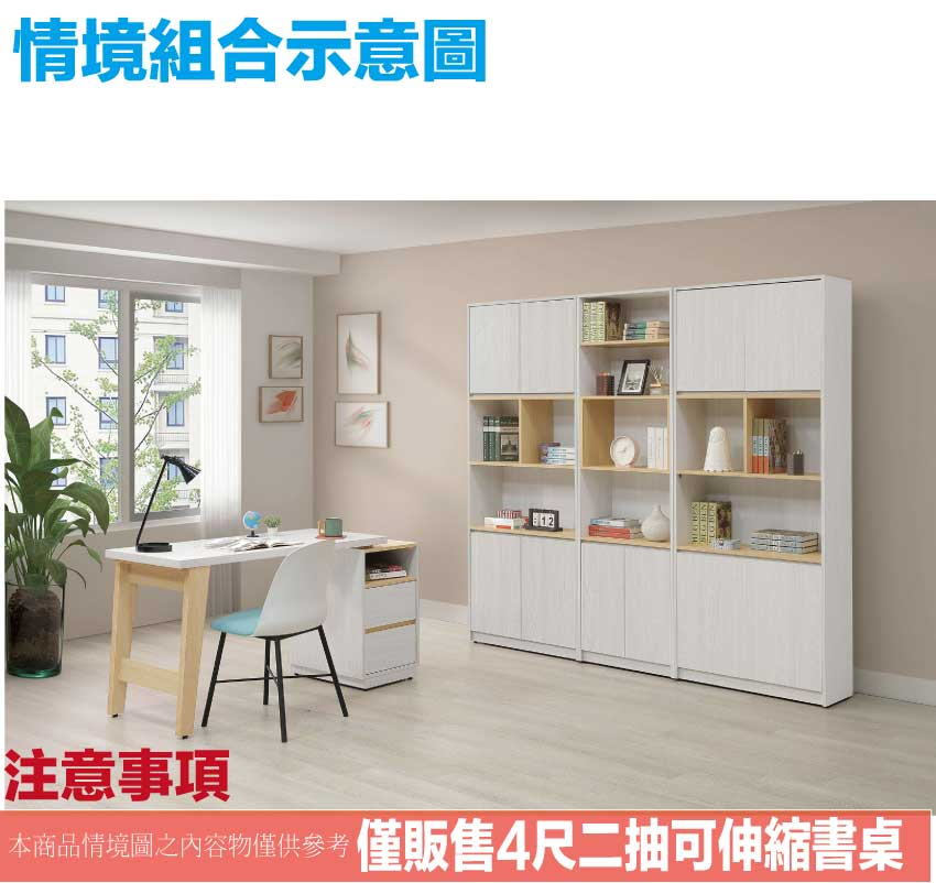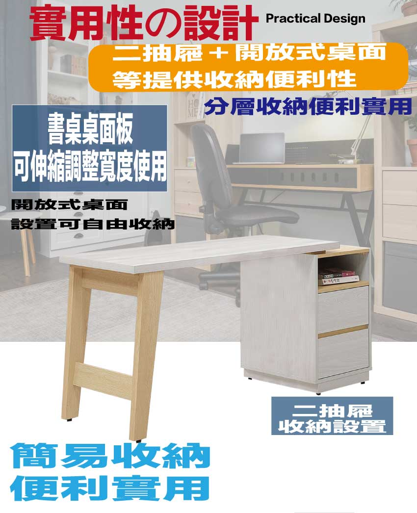 搭配採用二抽屜+可伸縮桌面板+開放層格等收納空間設計
