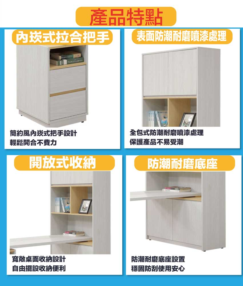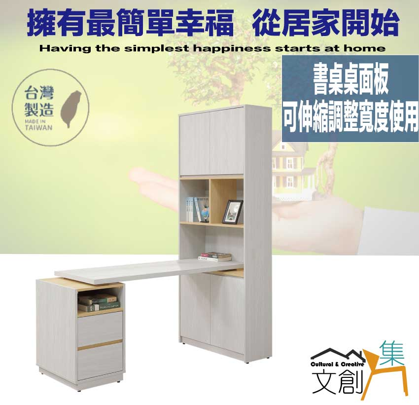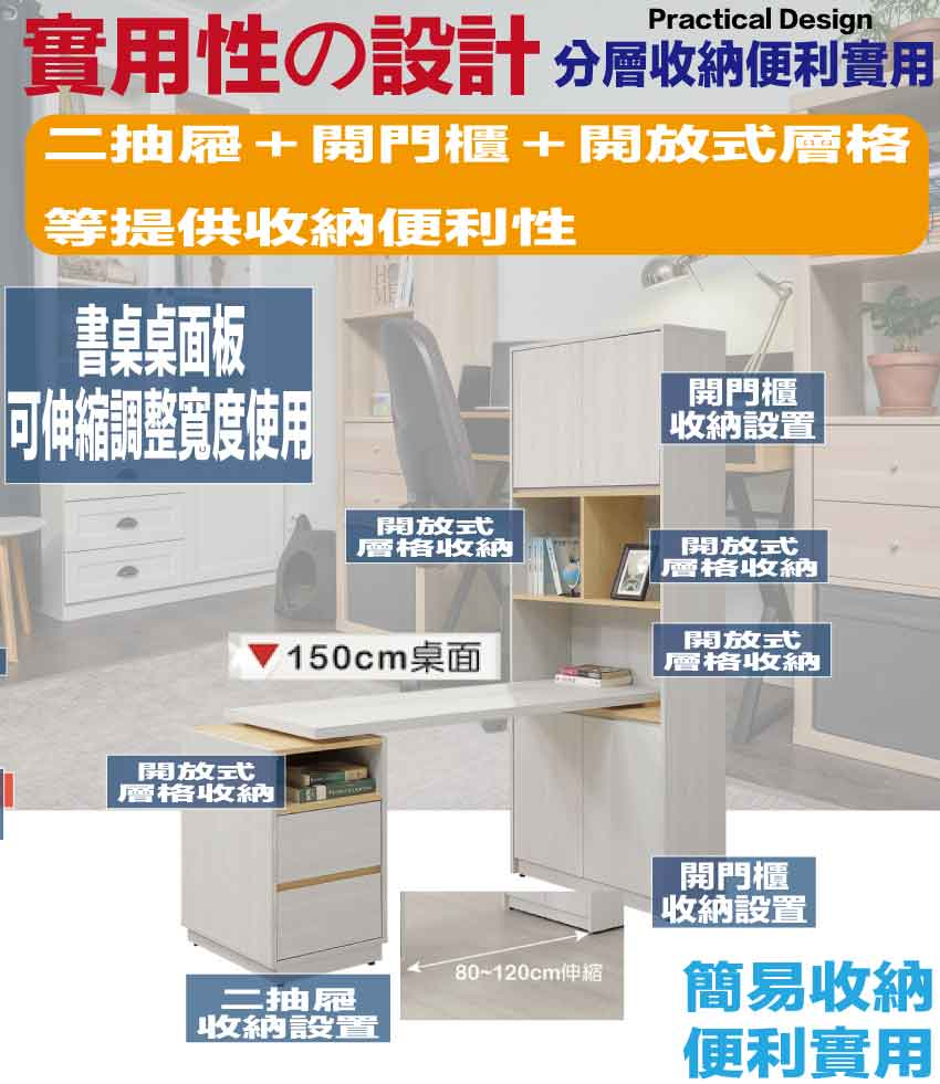 搭配採用開門櫃+二抽屜+可伸縮桌面板+內&外開放層格等收納空間設計