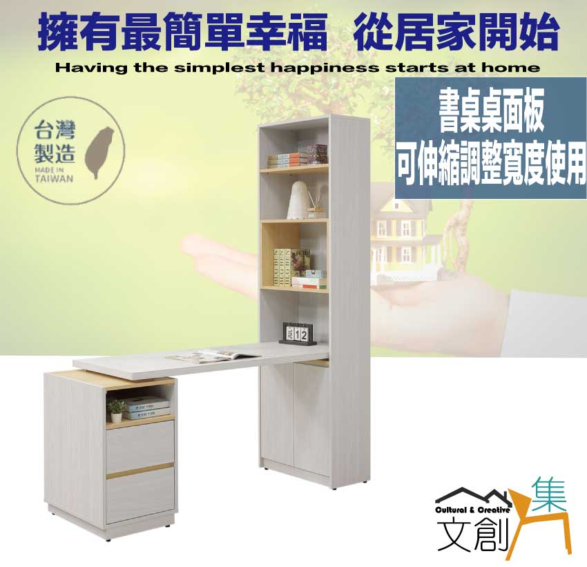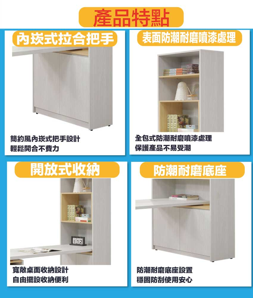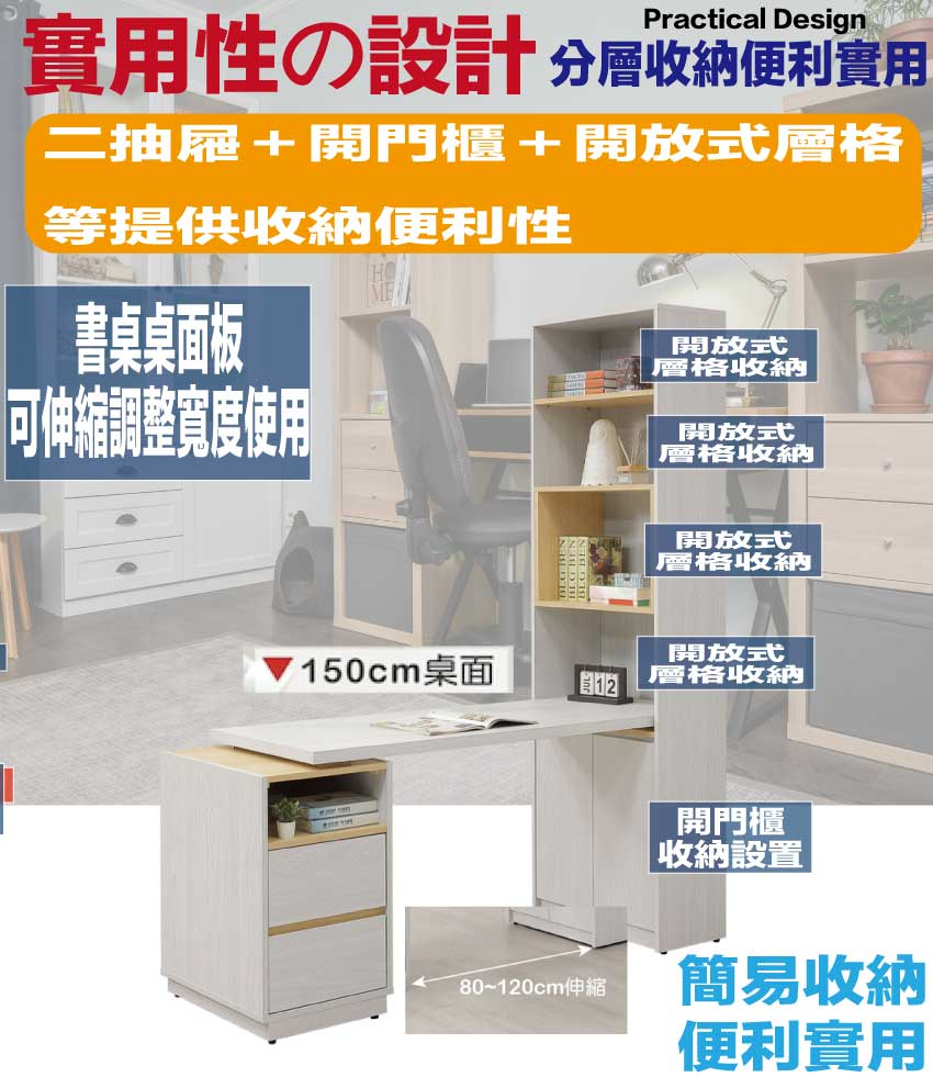 搭配採用開門櫃+二抽屜+可伸縮桌面板+內&外開放層格等收納空間設計