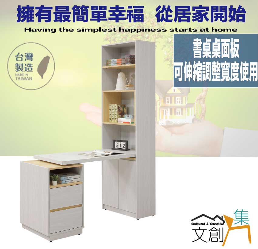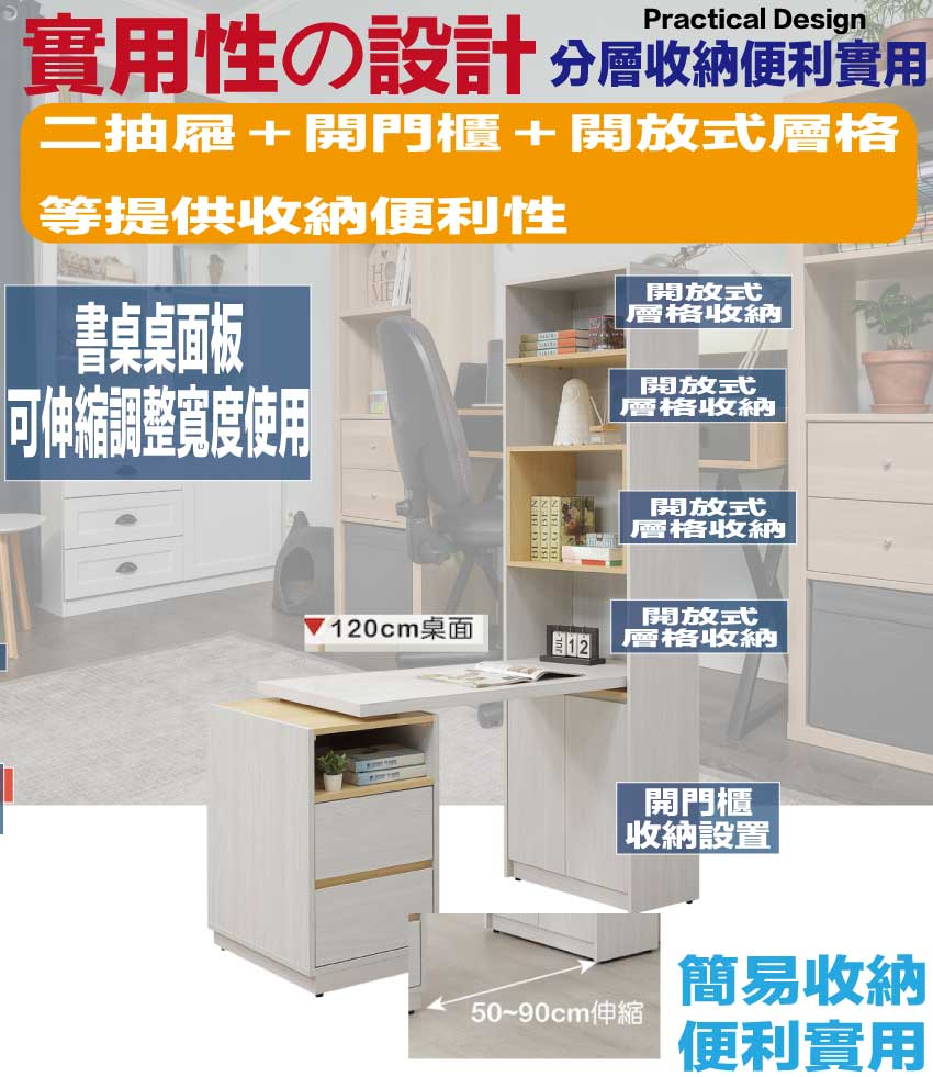 搭配採用開門櫃+二抽屜+可伸縮桌面板+內&外開放層格等收納空間設計