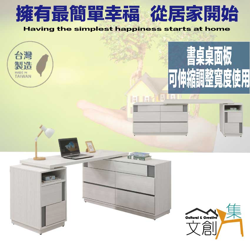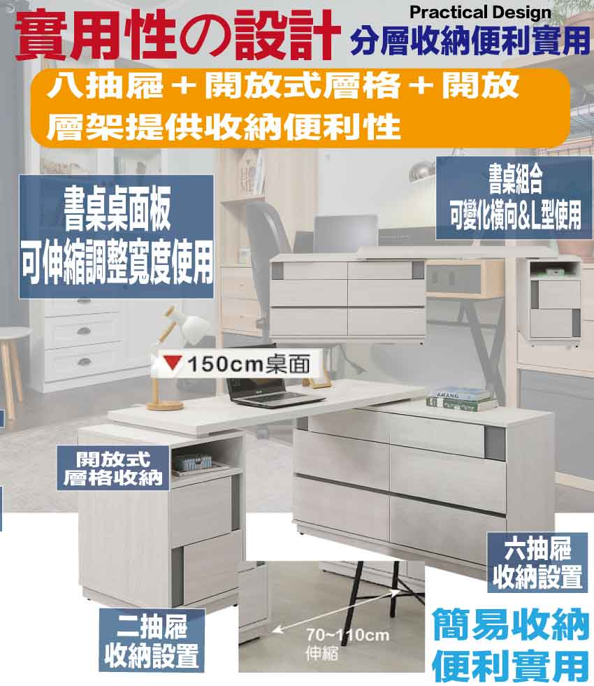 搭配採用八抽屜+可伸縮桌面板+開放層格等收納空間設計