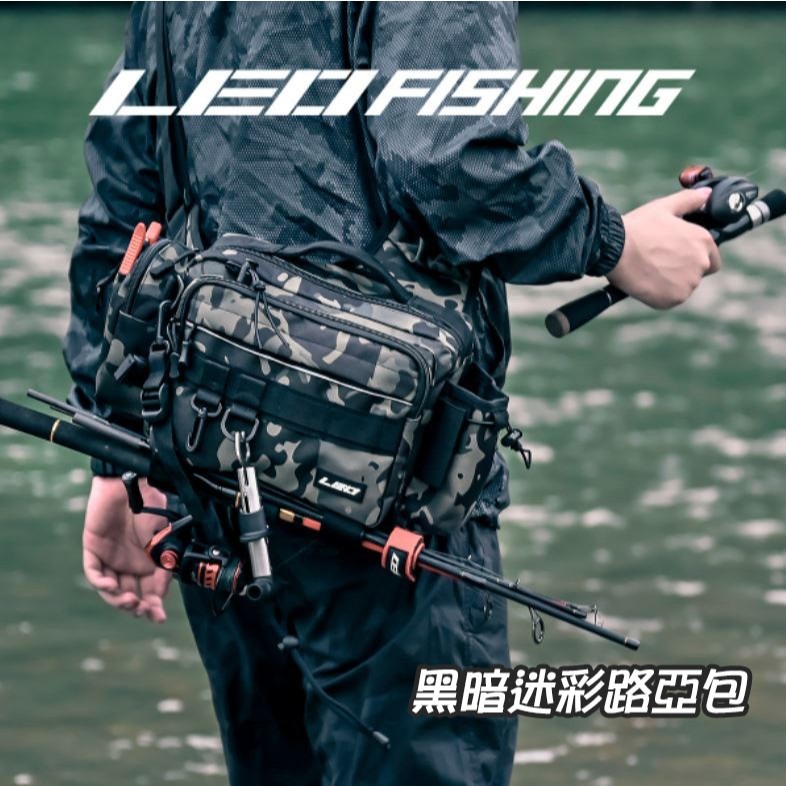 功能說明:本包單肩加腰帶固定,主要裝路亞餌、路亞鉗、水瓶、控魚器等涉及路亞釣的用品。包的下方有兩條束竿帶,可固定備用魚竿。