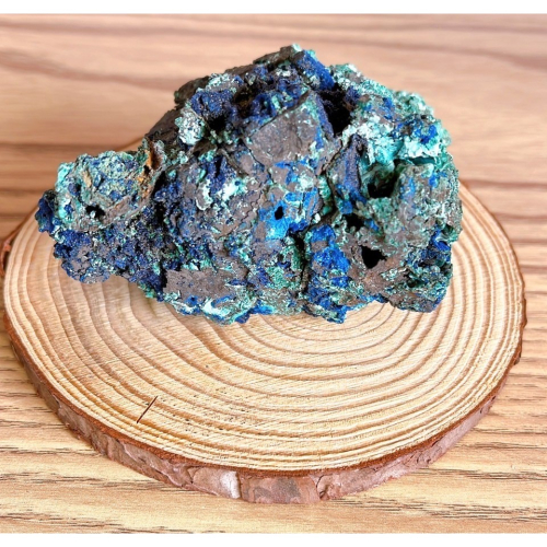 珍貴的藍銅礦,擁很美又奪目的寶藍色與閃閃亮亮的綠色,是由藍晶石、孔雀石、綠松石、青金石共生,它的能量能活化思維能力/直覺力/想像力,被視為自觀和智慧的象徵,用藍銅礦來冥想很有幫助。