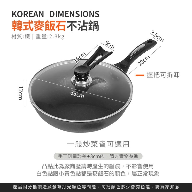 【商品特色】 1.合金導熱底,長久使用不凸底 2.麥飯石不黏塗層七層噴塗滲透,有效延長鍋具使用壽命 3.鍋體不黏工藝處理,好清洗一沖即淨 4.無鉚釘設計一體成型,握把省力好操作 【規格】 材質:鐵 鍋口直徑:32cm 內容物 : 麥飯石不沾鍋一個 / 防溢出鍋蓋一個 【下單注意】 本商品因體積限制,超取限制如下: 超取限1 如果您選擇超商取貨,請注意內文購買數量的限制,否則將因體積過大無法出貨。 本賣場為了保護您包裹的運送安全及商品品質,部分商品無法宅配配送,以免物流配送時因重摔碰撞導致商品變形、損毀,目前系統已有限制配送選項,再麻煩您依照系統選項分開下單。 #韓式麥飯石不沾鍋 #平底鍋 #不沾鍋炒鍋 #平底鍋不沾鍋 #麥飯石煎鍋 #不沾平底鍋 #不沾炒鍋 #炒菜鍋不沾鍋炒鍋 ★★購物附發票,購物有保障 ★★平價批發工廠提供您高CP值商品,價格保證工廠甜甜價