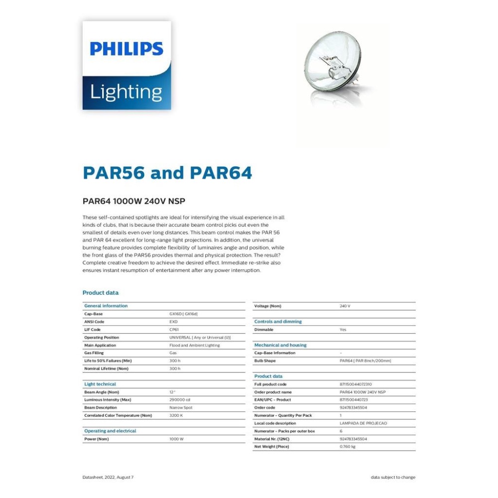 飛利浦PAR 64 220V 1000W 舞台燈泡