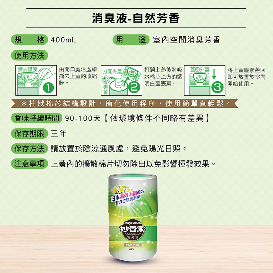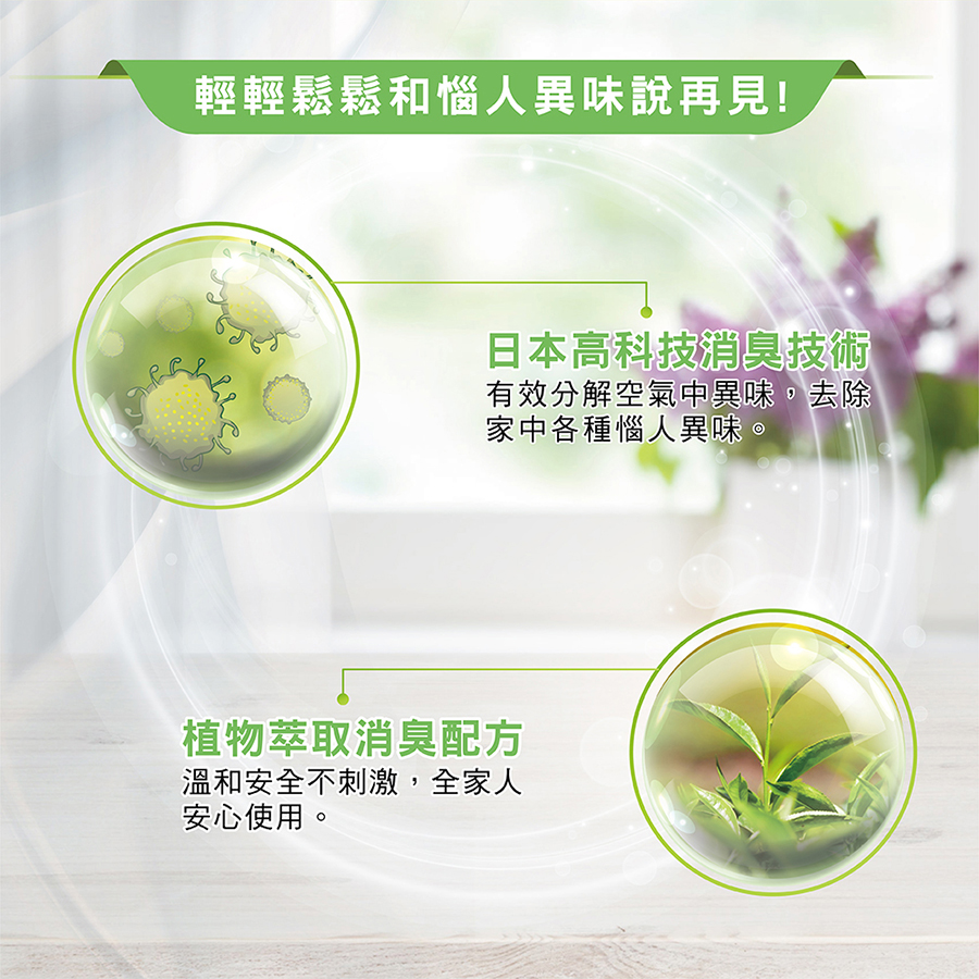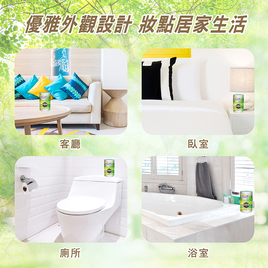 採用植物消臭劑,能去除廁所或室內之惡臭異味,並帶來舒適宜人的香味,除臭芳香更持久。