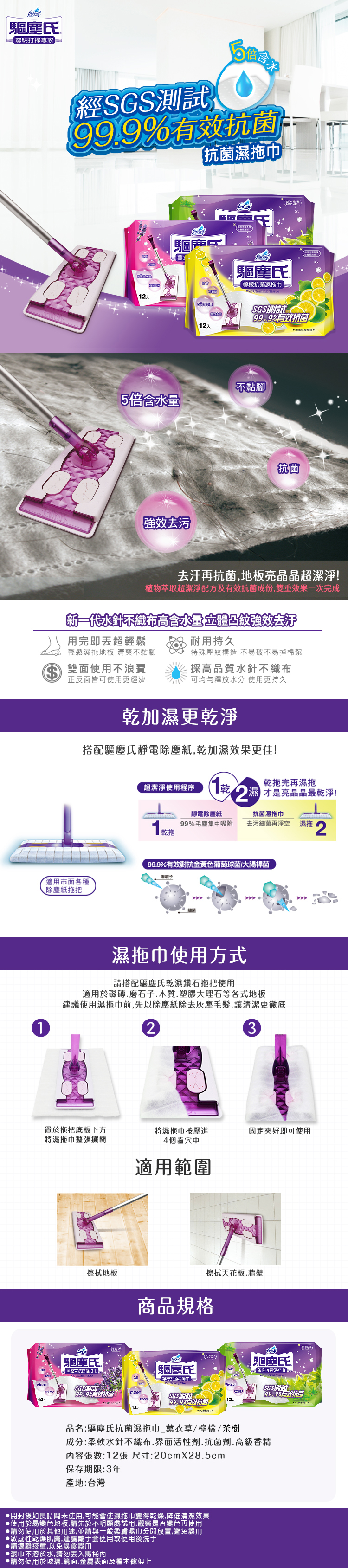 驅塵氏 抗菌濕拖巾 薰衣草/檸檬/茶樹 高品質水針不織布:均勻釋放水分 雙面使用更經濟:正反面皆可使用