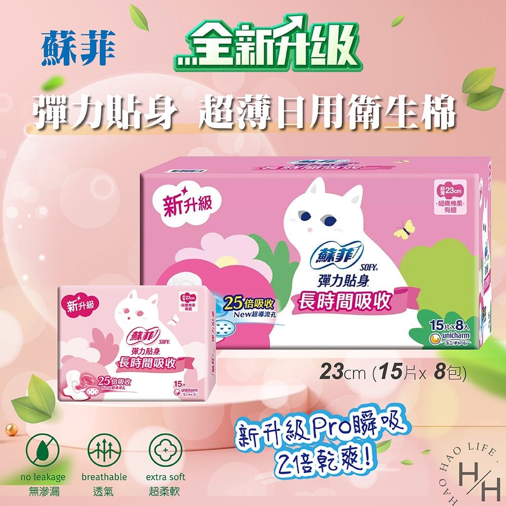 品名蘇菲 彈力貼身 超薄日用衛生棉 23公分 15片 X 8包