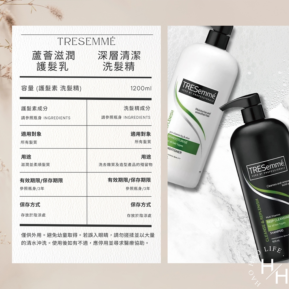 ★使用方法:將適量的洗髮精塗於濕髮上,以指尖輕輕按摩頭皮及髮根至產生豐富泡沫,再以清水徹底沖淨。建議配合TRESemme維他命原B5蘆薈滋潤護髮乳以達最佳效果。