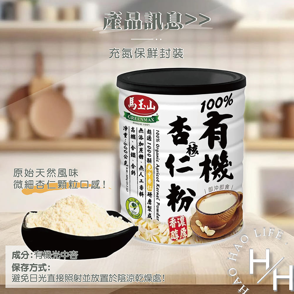 ★馬玉山100%有機杏(核)仁粉,嚴選有機光中杏,超過1000顆完整光中杏仁研磨製成,保有微細杏仁顆粒口感🫘