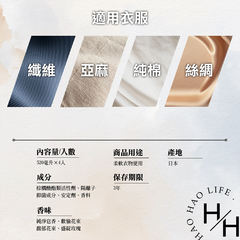 棕櫚酸酯類活性劑、陽離子抑菌成分、安定劑、香料商品用途柔軟衣物使用,棉、毛、人造絲及合成纖維等可水洗衣物均可使用