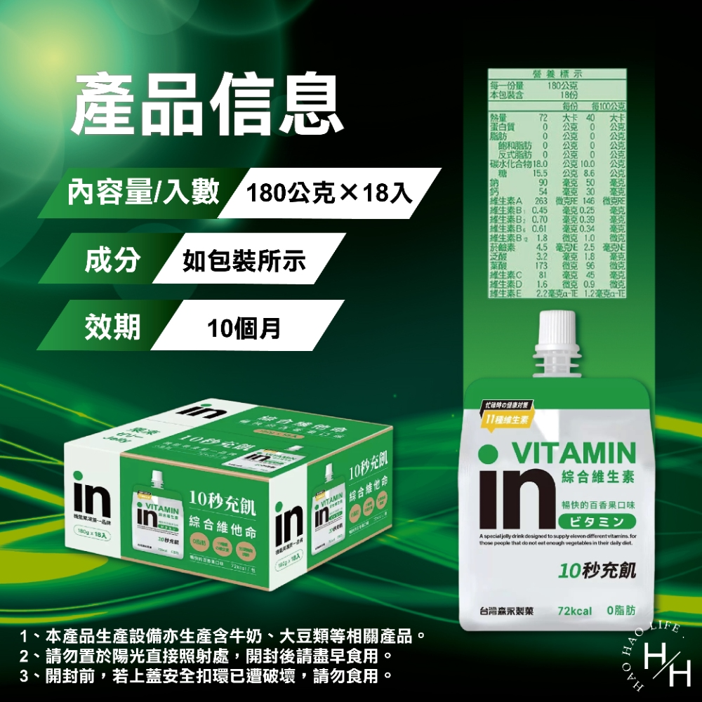 成分﹔水、高果糖糖漿、百香果果汁、檸檬酸、乳酸鈣、結蘭膠、檸檬酸鈉、維生素C、百香果香料、氯化鉀、三仙膠、葡甘露聚糖、泛酸鈣、乳化劑(脂肪酸蔗糖脂)、菸鹼酸、維生素E、維生素B1、維生素B2、維生素B6、維生素A、葉酸、維生素D(羊毛來源) 、維生素B12