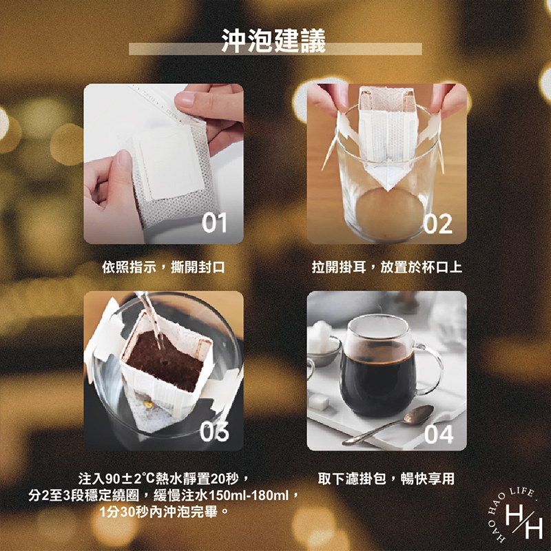 注入180ml~200ml熱水(90°C~94°C),靜待一會,即可享用