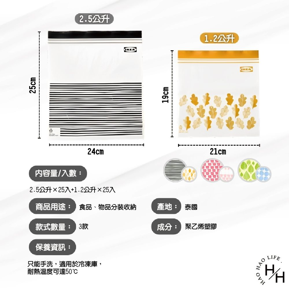 內含:25件2.5公升保鮮袋(袋內尺寸24x25公分)和25件1.2公升保鮮袋(袋內尺寸21x19公分)