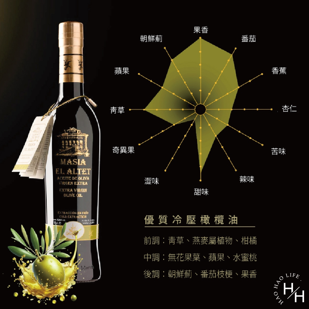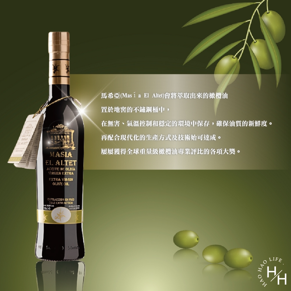 馬希亞(Masía El Altet) 特級冷壓橄欖油的萃取是藉由高科技設備,並在極低溫且快速榨油的生產過程分成兩階段執行,以最精粹的提煉方式保存其濃郁的味覺與獨特的香氣。多虧在低溫的環境中提煉橄欖油🫒,得以從每顆橄欖🫒中萃取最大量的精華,將會置於地窖的不鏽鋼桶中,在無害、氣溫控制和穩定的環境中保存,確保油質的新鮮度。,在於依循傳統的橄欖植栽,源自西班牙國王卡洛斯三世於十八世紀栽種至今,再配合現代化的生產方式及技術始可達成。屢屢獲得全球重量級橄欖油專業評比的各項大獎。
