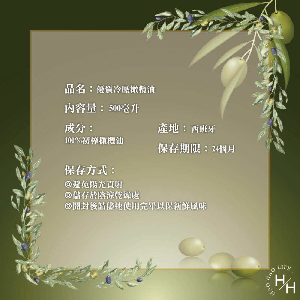 製程:冷壓初榨,保留橄欖的天然香氣與營養