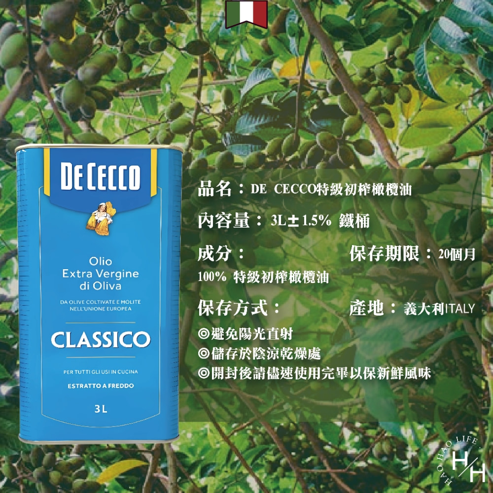 商品品名: 聯馥DE CECCO特級初榨橄欖(鐵桶)
