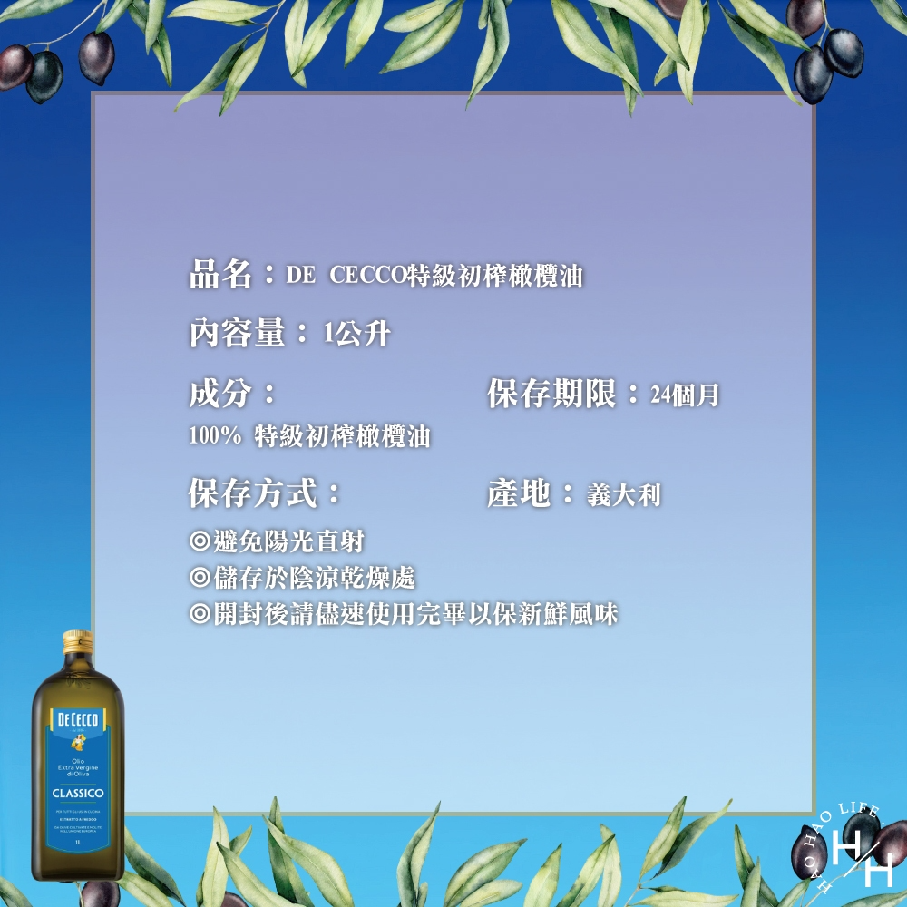 商品品名: 聯馥DE CECCO特級初榨橄欖(藍標)