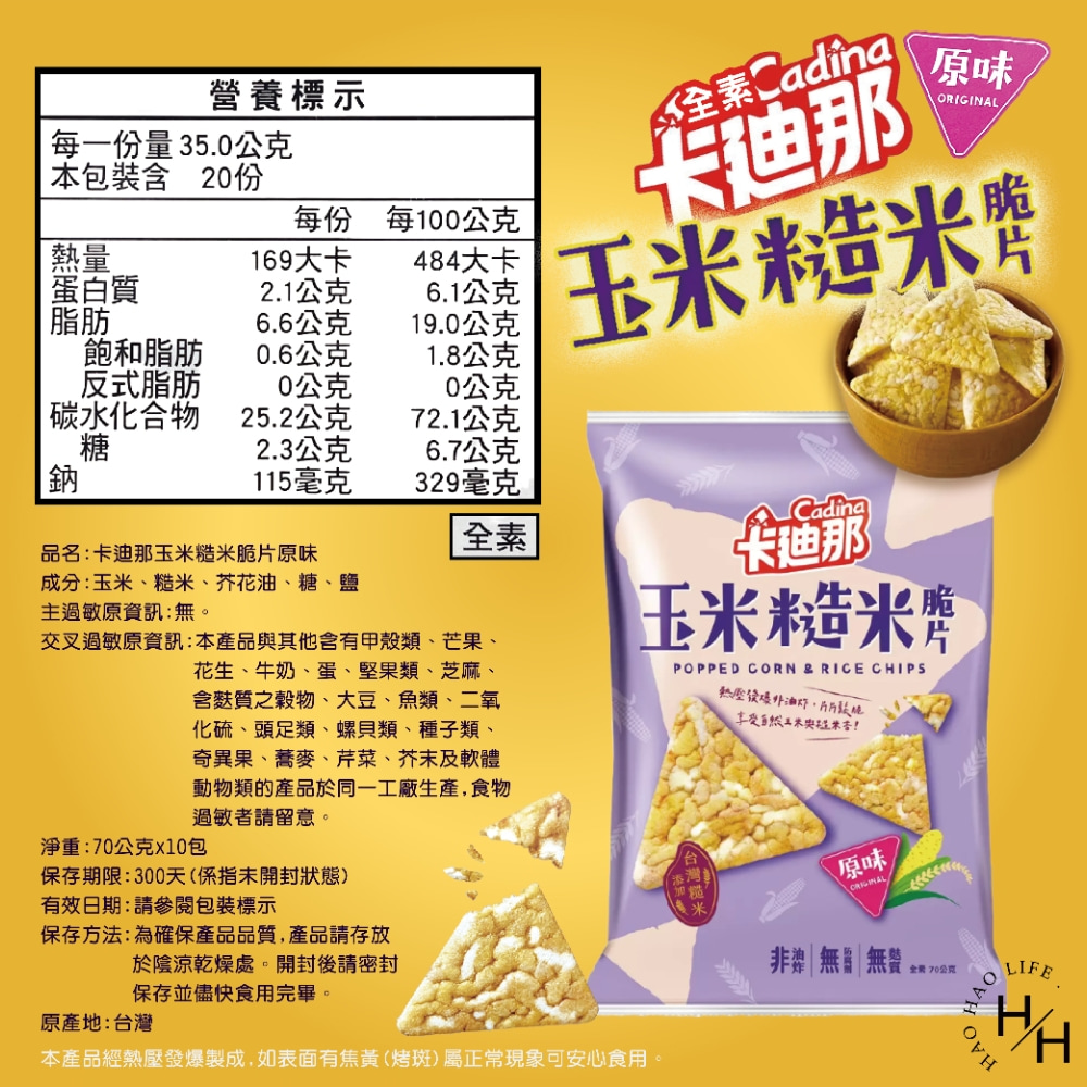 品名 : 卡迪那 玉米糙米脆片原味 70公克 X 10包