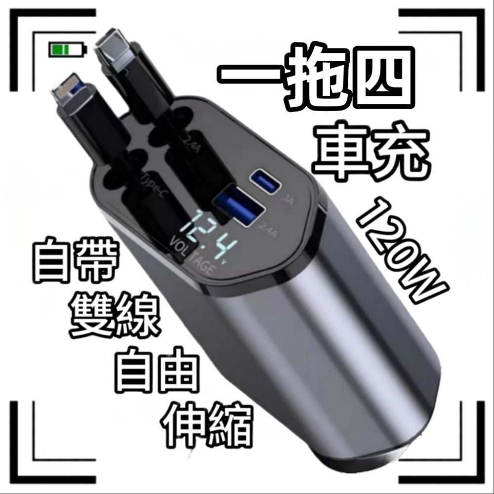 🔹120W 四口同時一起使用不是問題 🔹 可伸縮充電線 告別車內雜亂 🔹 數位顯示藍色柔光螢幕展現 🔹 自由伸縮 充電方便又省心 🔹 超級快充 即插即用