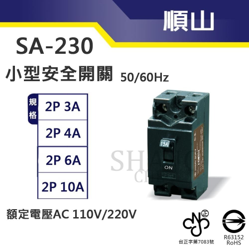 順山 SA-230 安全開關 小型無熔絲開關 2P 3A 4A 6A 10A 110V/220V 通過BSMI商檢局驗證