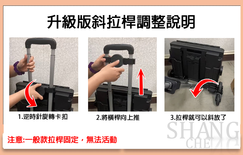 升級款4輪(桿子可活動/蓋子一體掀蓋):斜拉、平拉(桿子可活動,箱子平整拖拉更省力,如內有放飲料或是開封食品,不會翻倒)