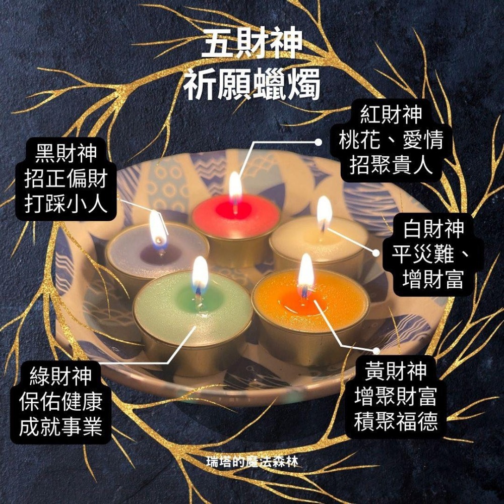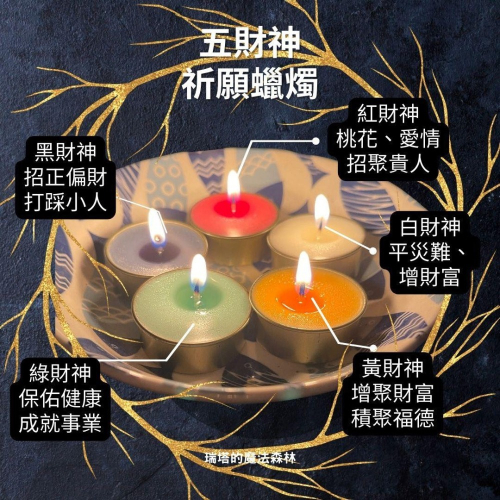 使用五財神蠟燭祈願,幫助個人需求補充財運,心想事成。