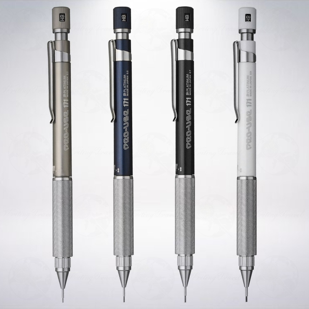 日本白金公司在2017年5月中甫發售的「PRO-USE 171製圖自動鉛筆」,為製圖筆產品線再添一員悍將,主要有2個特點,1個是轉動筆頭調整護芯管的長度,非使用時可以完全收納,使用時也可以視需求調整長度來控制與紙面的距離,另一個是配備所謂「安全滑動機構」可以在用力使用的狀況下避免筆芯斷裂且轉動筆身也可以控制這項機制是否作動。款式上面維持一貫風格,用顏色區分芯徑,有銀色(0.3mm)、藍色(0.5mm)、黑色(0.7mm)、白色(0.9mm)共4種,想嚐鮮的文具迷們,不要錯過喔!