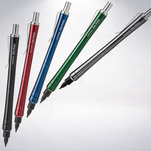 目前市場上少見的搭載自動出芯機制的平價自動鉛筆,使用時只要將筆芯按壓至與護芯管切齊即可開始專注於書寫,在過程中並不需要再次按壓筆帽送出筆芯。筆身形狀利於手握,大量使用金屬鋁製作,為質感增添不少分數。此款式為2018年全新推出的金屬色款式,筆身以亮面呈現,有亮黑色、紅色、海軍藍、綠色、灰色共5種款式,整體來說十分亮麗,質感極佳。