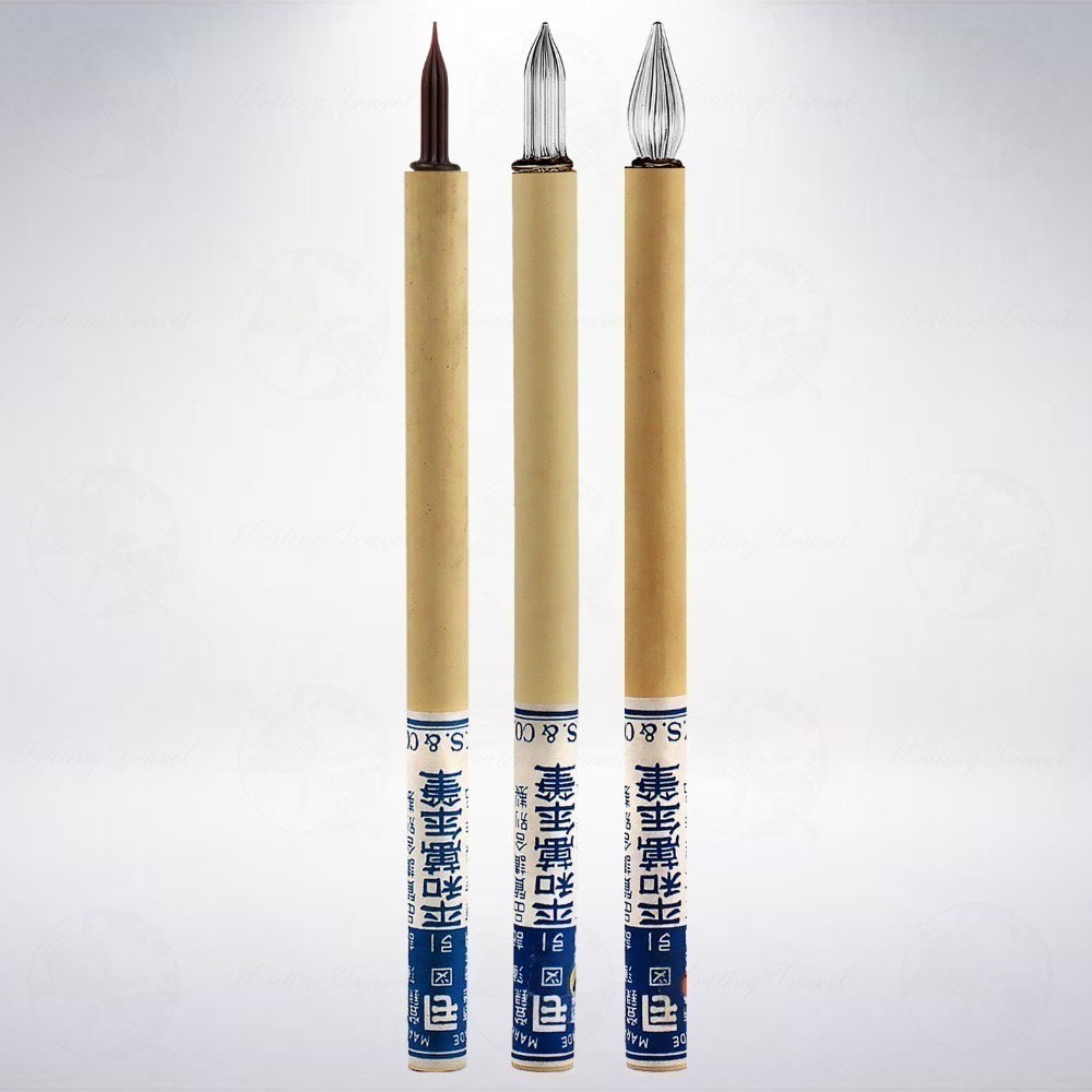 佐瀬工業所製竹軸玻璃筆組,包含3種筆尖粗細,細字(琥珀色)、中字(透明)和太字(透明),讓你一次滿足書寫上的需求。這款玻璃筆頭,有8個溝槽,且溝槽刻紋深,所以沾一次墨,約可寫滿一張明信片。且因筆身為竹子材質,並不用擔心容易摔壞,只需保護好筆頭即可,算是易於隨身攜帶的玻璃筆。