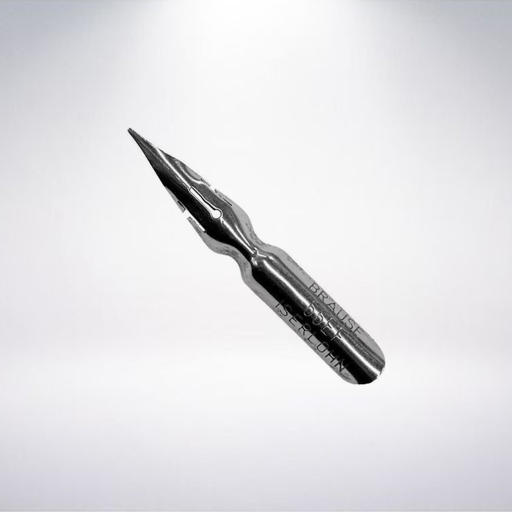外觀: 筆尖的墨孔如鑰匙孔造型,墨孔左右兩側各有如扁c的溝槽,因其形狀如箭,也稱為箭尖(Arrow Nib),筆身刻有BRAUSE 66EF ISERLOHN。