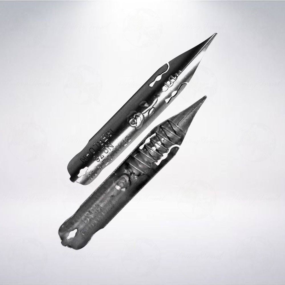 特色: 筆尖軟彈,粗細變化大,適合寫大字,新筆尖需去除表面保護油,方能順利出墨。此筆尖內側嵌入彈簧式儲墨器,除了改善出墨問題外,若將整個彈簧儲墨器裝滿墨水(可用滴管輔助),寫字續航力大幅提升,約莫可寫英文字母50個(墨水不同可能稍有差異)。