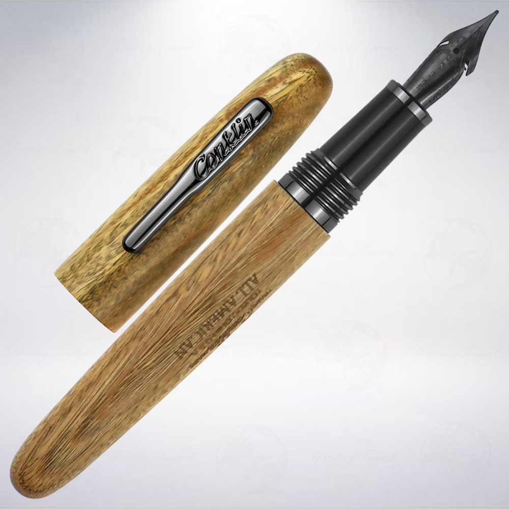 美國百年的鋼筆公司「Conklin」,秉持創新的精神,以旗下知名鋼筆系列: 「All American」為藍本設計,筆身以莫三比克綠木,筆身刻印「TRADE Conklin MARK TOLEDO, OHIO, U.S.A. ALL AMERICAN」,是一款大型而舒適的鋼筆。搭配同為金屬槍色的筆夾與飾環,個人風格強烈。筆尖方面採用不鏽鋼製作,並施以黑化處理,書寫滑順,足以應付一般使用需求,另外,「Omniflex彈性尖」為2018年開始推出的特殊筆尖,讓書寫有如海洋潮汐般的律動,粗細線條豐富,渾然天成。筆尖經過精心設計和切割,獲得最佳性能,經過適當施壓,兩側筆尖將會劈開,製造不同粗細線條,最粗約莫可至1.0mm左右,不論練寫中文隸書,或英文銅板體等,都可發揮獨特寫字風格。筆身的密封性十分良好,上墨的方式為吸墨器與卡水,可以隨使用狀況適度調整。限量版本,於筆蓋上刻「Limited Edition」和限量編號,全球限量898支,不僅實用性高,且具有收藏價值。