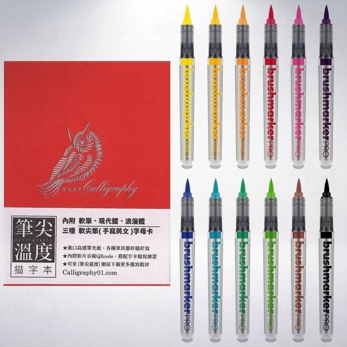 1. 套組內容包含「筆尖溫度英文書法專用紅皮描字本」1本、「Karin BrushmarkerPRO 基本12色軟筆刷麥克筆組」1組,包括淡黃色/Canary 166、金色/Gold 283、琥珀色/Amber 195、紅色/Red 209、櫻桃色/Cerise 375、紫丁香/Lilak 226、皇家藍/Royal Blue 045、綠松石/Turquoise 654、海洋綠/Ocean Teal 377、 草綠色/Grass 253、棕紅色/Henna 105、 黑色/Black 030各1支。