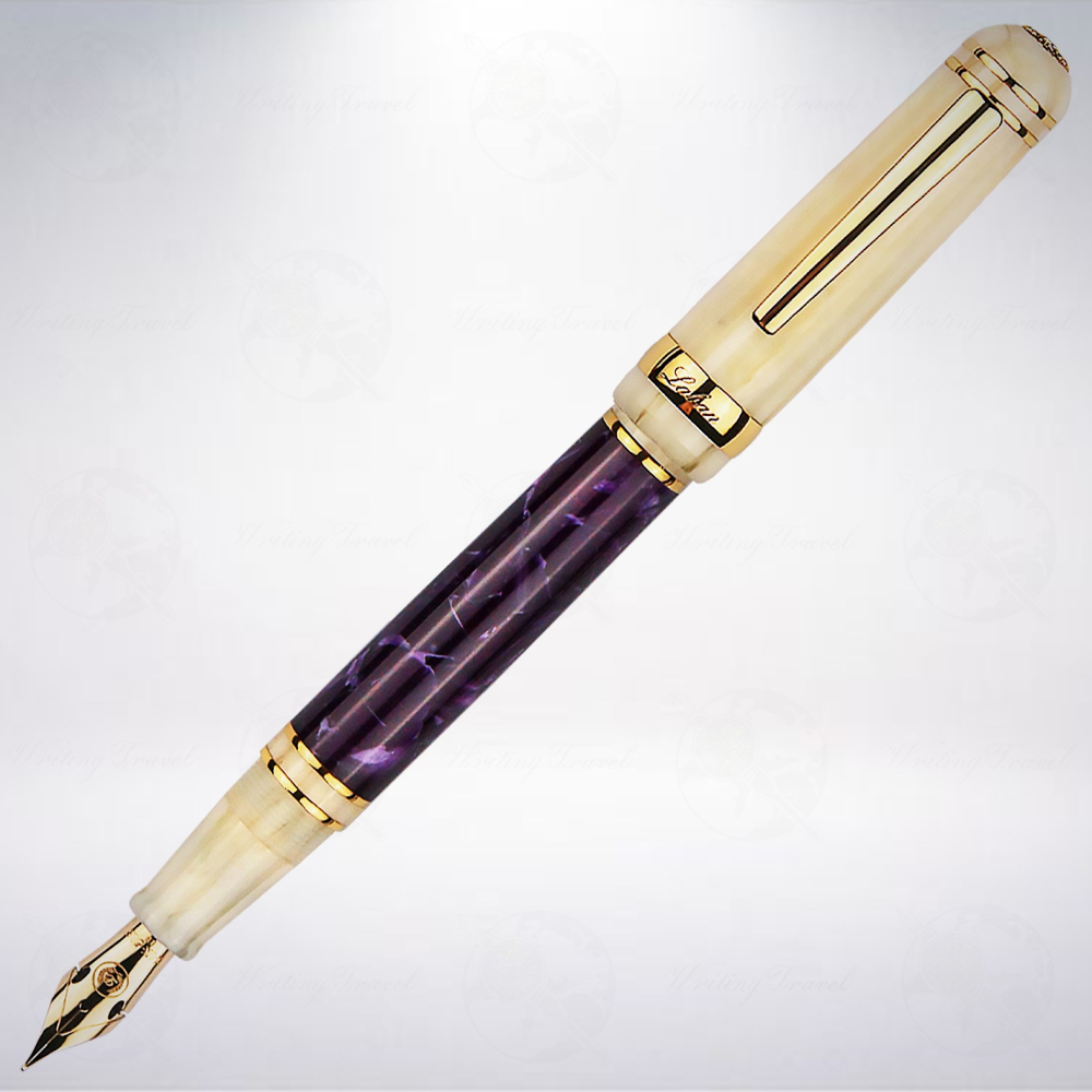 筆尖採用德國「WIN 12」14K金 彈性尖,筆尖滑順,彈性佳,筆幅最粗約莫1mm。筆尖上刻有Laban標誌,以及14K-858和筆尖尺寸,質感精緻。整支筆桿採用經典的樹脂材質,台灣師傅調配深淺紫色交錯染色,彷彿從初初綻放的淡紫 、直到烈日下開最豔時的深紫。將初夏盛開的紫藤花,都凝聚在掌心裡。旋轉筆桿,享受光線折射出的色彩變化,重量輕巧、耐水性高,手汗持筆書寫也很舒適。持握時,散發樹脂材質的輕盈感。特有的設計平衡,重心適中,書寫不費力,長時間使用、手腕也不會感覺疲累。天冠部分,鑲嵌金質品牌象徵標誌。鋼筆收納於西裝胸前時,天冠獨特的存在感,襯托優雅氣質。筆夾、筆夾雙金環、以及筆蓋環,分別以鍍金、與金屬飾片裝飾,讓高質感孕育而生。