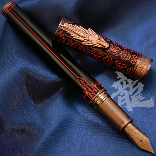 琺瑯烤漆材質的筆身,筆身設計以碳黑作為基礎,搭配紅銅色髮絲線的金屬筆飾,顏色搭配如同其家族家徽-黑底紅色的獨身三頭噴火龍,而筆身紫紅色圖紋使整體視覺熠熠生輝。