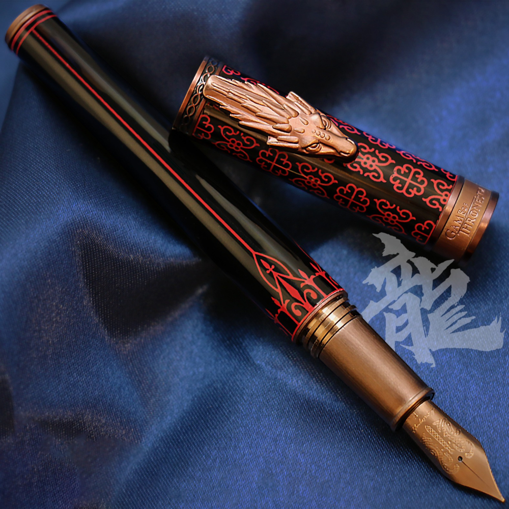 筆蓋有兩種紫紅色花卉圖紋,筆環呈現紅銅色髮絲紋,一面刻有「Game of Thrones™」,一面刻著「Montegrappa」標誌,筆夾以代表Targaryen的噴火龍頭打造,同時在筆蓋的天冠可以看到三頭噴火龍以及家族箴言「Fire and Blood」的字樣。