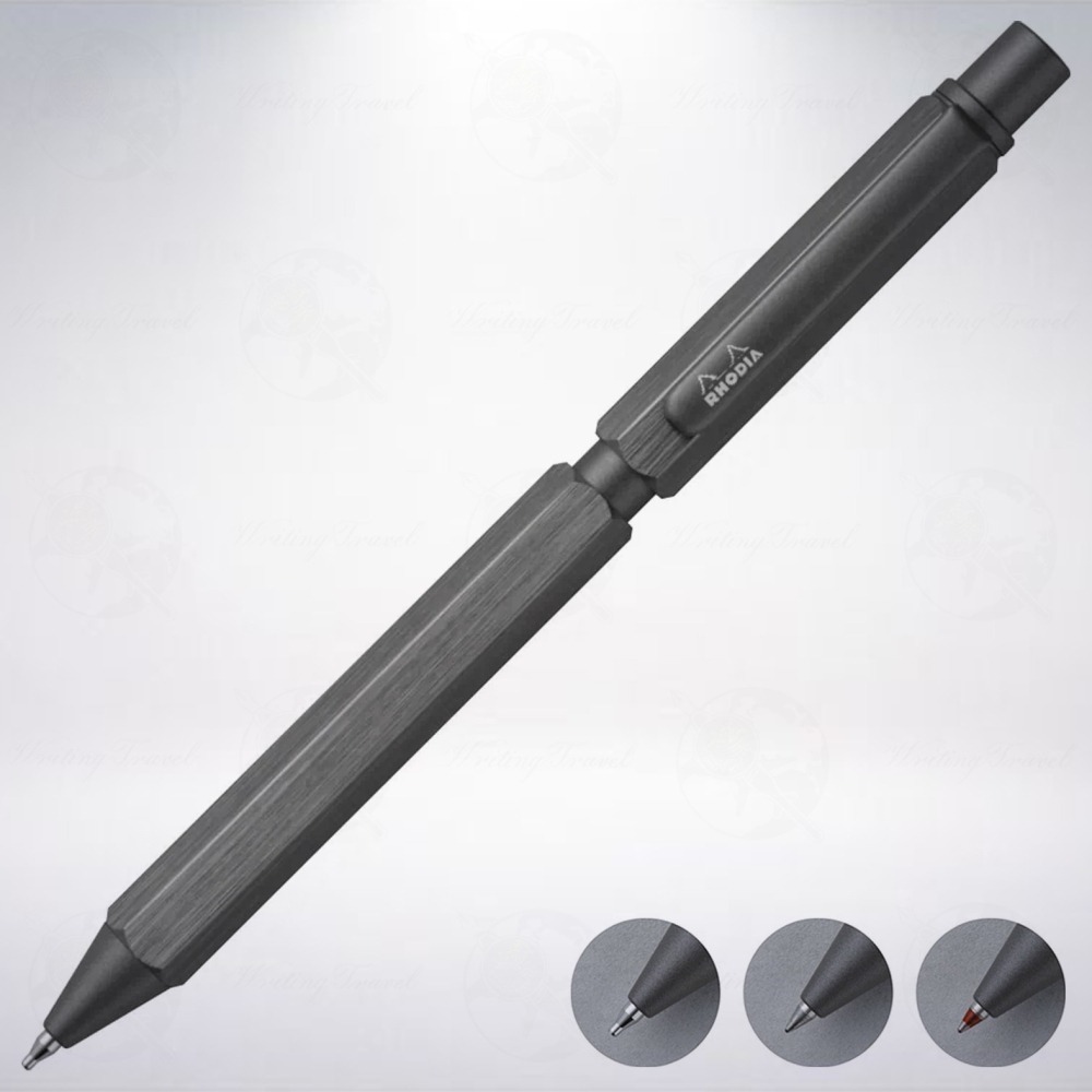 廣受大家歡迎的Rhodia「Script」系列繼連續5年推出「棕色/Light Brown」、「海軍藍/Navy Blue」、「紅色/Red」、「藍綠色/Blue Green」、「鼠尾草綠/Sage Green」與「金色/Gold」限定款而引起廣大文具迷的迴響後,再接再厲在2023年夏天推出第7彈: 「鈦色/Titanium」,形態採用鋁製六角形設計,並帶有漂亮生動的髮絲紋。功能上配備有黑色和紅色共2種原子筆與0.5mm自動鉛筆,只要旋轉筆身中間凹下的部分,即可輕鬆切換各種功能,要注意的是,填入鉛筆筆芯時,需抽出內部機件,將自動鉛筆機芯前端卸下後,填入適當數量筆芯,原廠建議為3支。使用前請務必詳閱說明書。