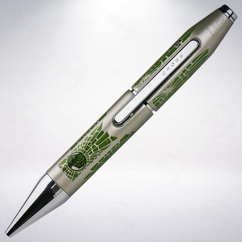 「高仕/CROSS」與漫威(Marvel)聯名推出的鋼珠筆系列。此款以復仇者聯盟中的超級英雄: 「綠巨人浩克/Hulk」為主題,以銀色與綠色為主色調。 屬無蓋鋼珠筆,寬筆身設計,柔和帥氣的線條,筆身圖案象徵其角色精髓,錐形筆身上方處更具有經典的獅子商標,配合力學開關機制,只需單手推開即可書寫,讓您想到的任何好點子都可以立即書寫。