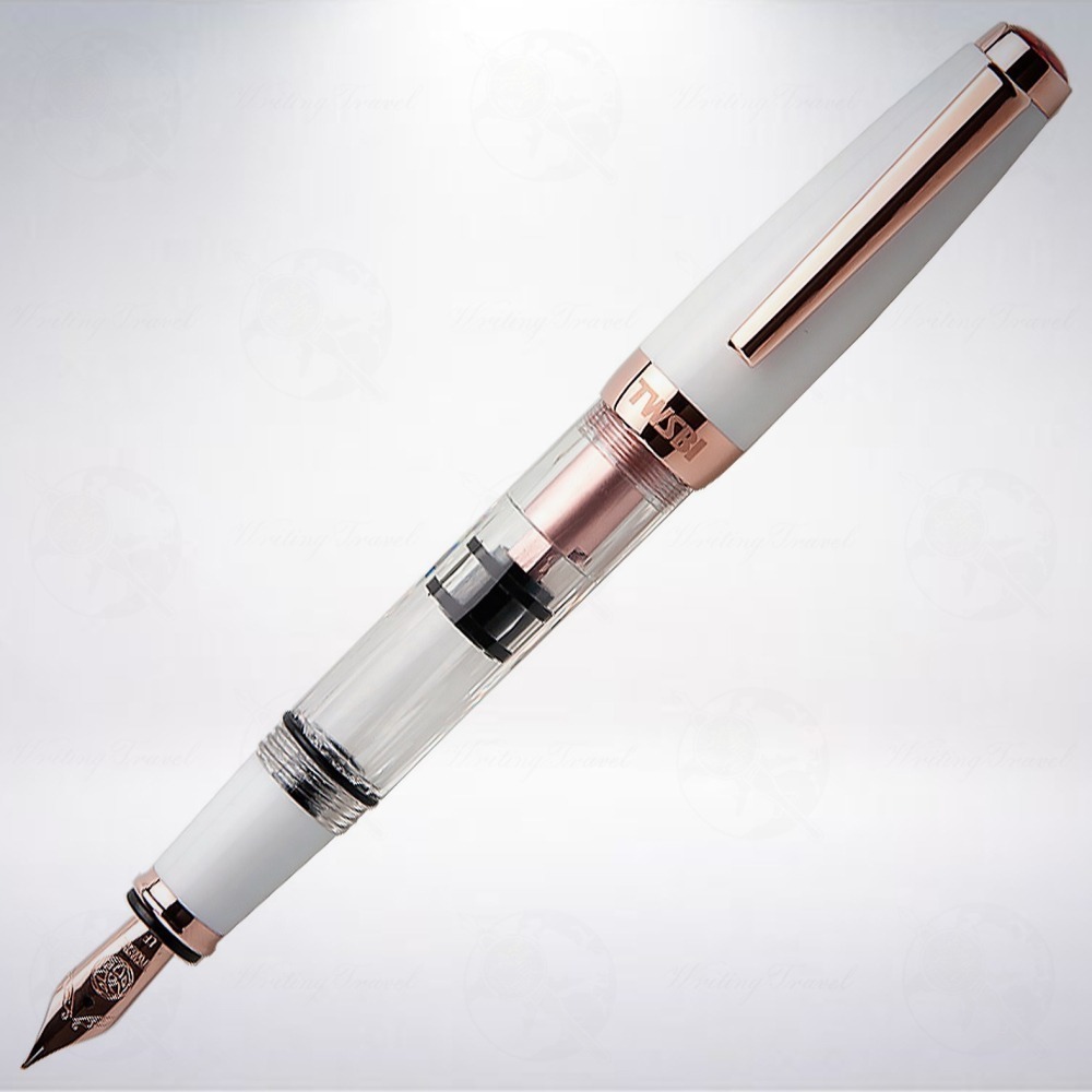 以活塞式上墨機制設計的優質鋼筆,以透明、玫瑰金、白色等主要元素組成,筆身透明的部分,除了可以清楚觀察到墨水量,也可以隨時欣賞漂亮的墨水顏色,堅固的白色筆蓋、鍍玫瑰金飾邊和不銹鋼筆尖,搭配起來,前後呼應,相得益彰。