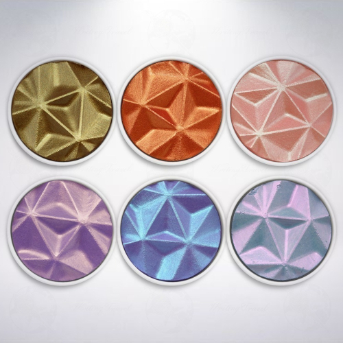 Coliro珠光水彩粉餅是由品質優良的雲母顏料(MICA)混和阿拉伯膠手工製作而成,確保每個顏色混和均勻。雲母是天然材質,由多種礦物質組成而成,且耐光耐熱,所以可以運用在任何可吸水的表面,例如紙、木材、石膏等。且這些材質皆屬天然形成。不同顏色間可以利用水當媒介,互相混和,形成不同各種不同的色調。本款式在表面上具有三角立體紋路組成的星狀造型,極具巧思。
