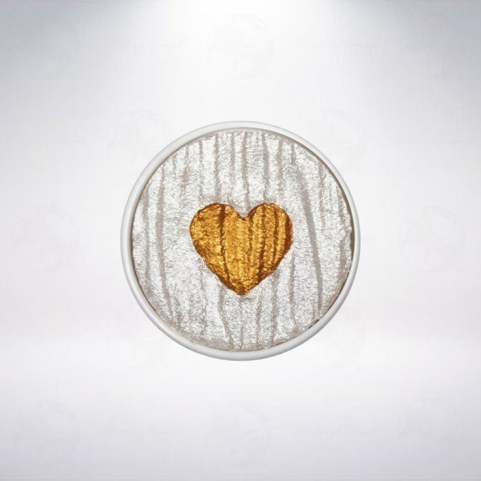 「金色愛心/Heart of Gold」是一款漂亮的雙色特別版水彩粉餅,中間有金色的愛心形狀。 透過雙色的混合過程,可以得到由銀色、香檳色到金色的多色調表現。外側以簡易的牛皮紙包裝,十分小巧可愛。