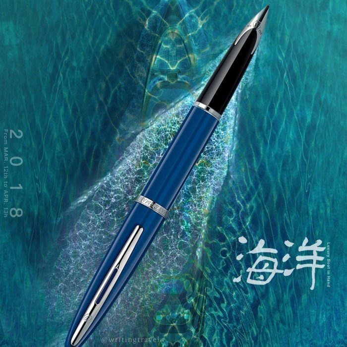 Waterman的創辦人路易士.艾臣.華特曼(Lewis Edson WATERMAN) 曾在當保險經紀人期間,因漏墨而失去一筆訂單,於是利用毛細原理,製造出第一支可信賴的鋼筆,並在1884年成立公司,開啟驚豔大家的創作鋼筆之旅,一一呈現艾臣、海洋、權威等經典筆款,帶領大家使用他們的鋼筆,發揮隱潛在您身體內的想像力和創造力,讓您相信當書寫成為樂趣,美好的事物即將發發生。「海洋」系列以豪華郵輪為藍圖,設計筆身筆尾,筆蓋貌似海豚之鼻頭嘴,完全融入海洋世界,優美線條,加上利用高級金屬漆製的海藍色,完美絕配,而18K金的崁入式筆尖,讓人更進一步享受書寫帶來的樂趣。