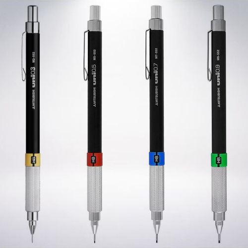 三菱鉛筆所出品的實用製圖筆,樹脂筆身,搭配細密的咬花握位,金屬製的筆頭與筆帽,整體重量只來到約12.6公克,十分輕盈,使用上也沒有負擔。4mm護芯管、筆芯硬度指示窗 (4H/3H/2H/H/F/HB/B/ 2B)、筆身橡皮擦,製圖筆應該具備的功能都備齊了,雖然外觀素雅,但整體來說是1個忠實的桌上夥伴。芯徑部分有0.3/0.5/0.7/0.9mm,依其不同而在筆芯硬度指示窗顯示不同的顏色。