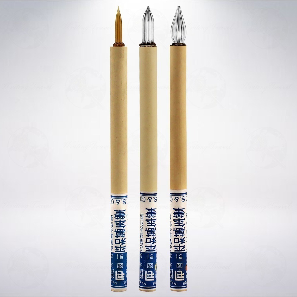 佐瀬工業所製竹軸玻璃筆組,包含3種筆尖粗細,細字(琥珀色)、中字(透明)和太字(透明),讓你一次滿足書寫上的需求。這款玻璃筆頭,有8個溝槽,且溝槽刻紋深,所以沾一次墨,約可寫滿一張明信片。且因筆身為竹子材質,並不用擔心容易摔壞,只需保護好筆頭即可,算是易於隨身攜帶的玻璃筆。